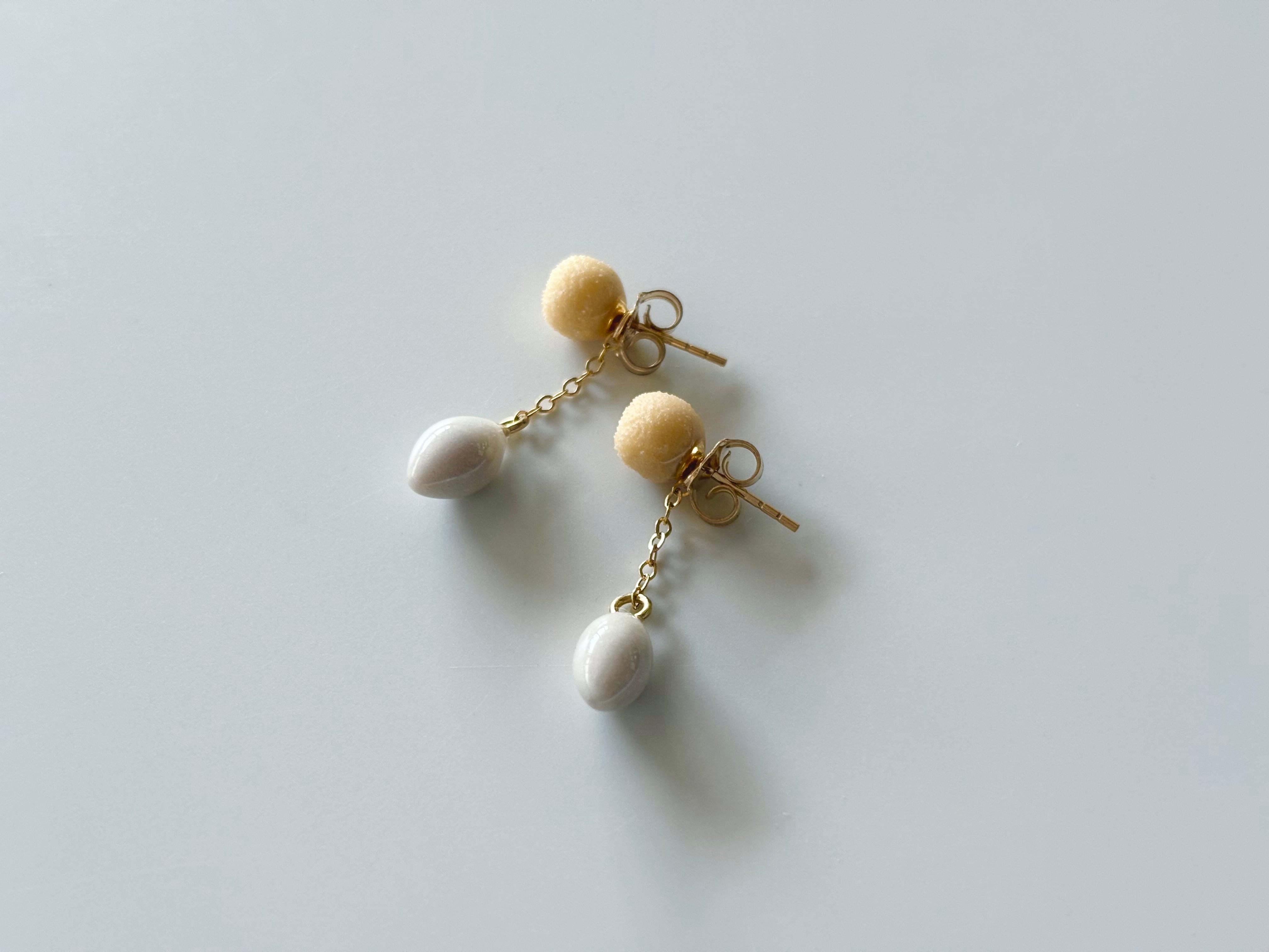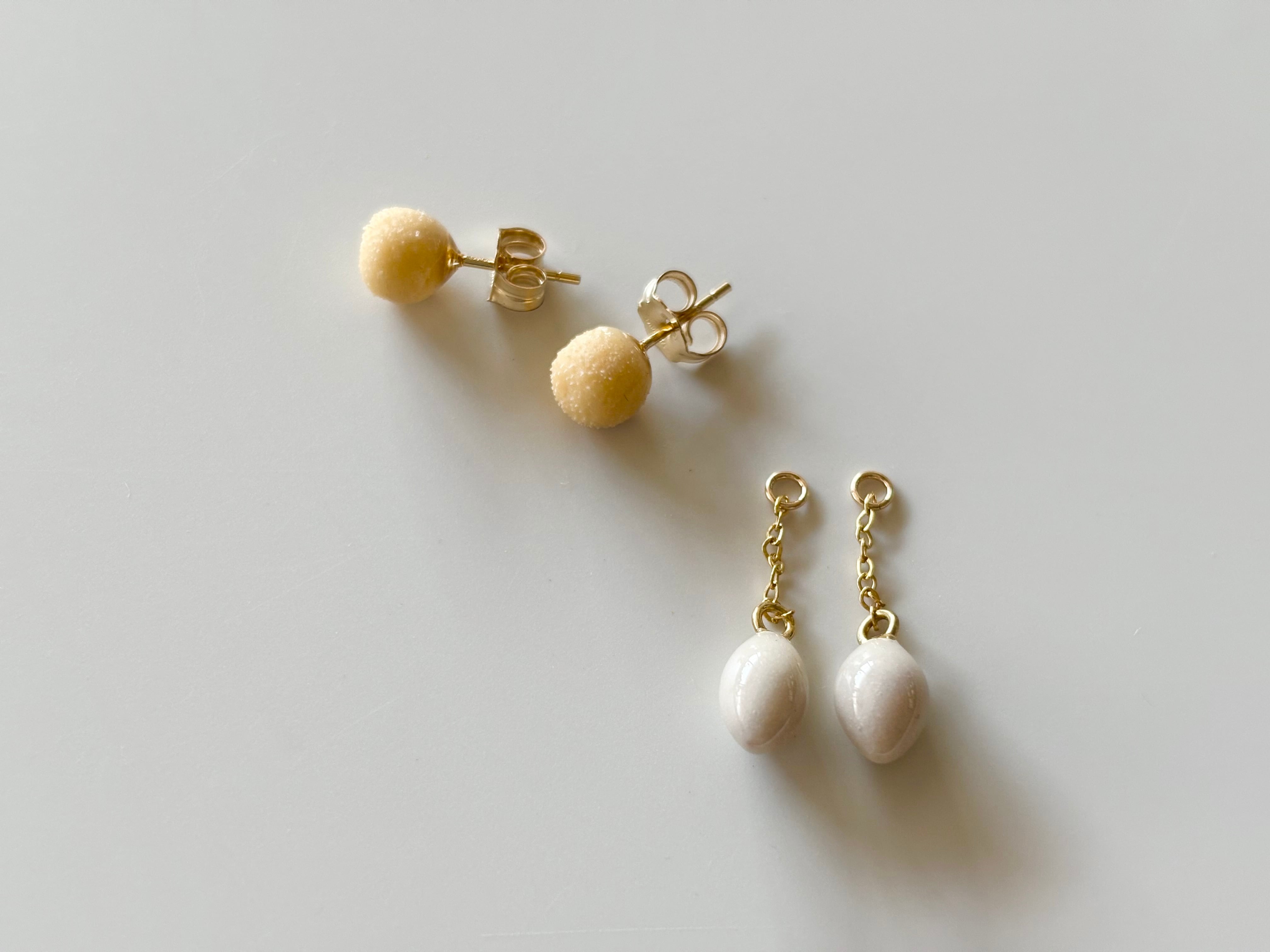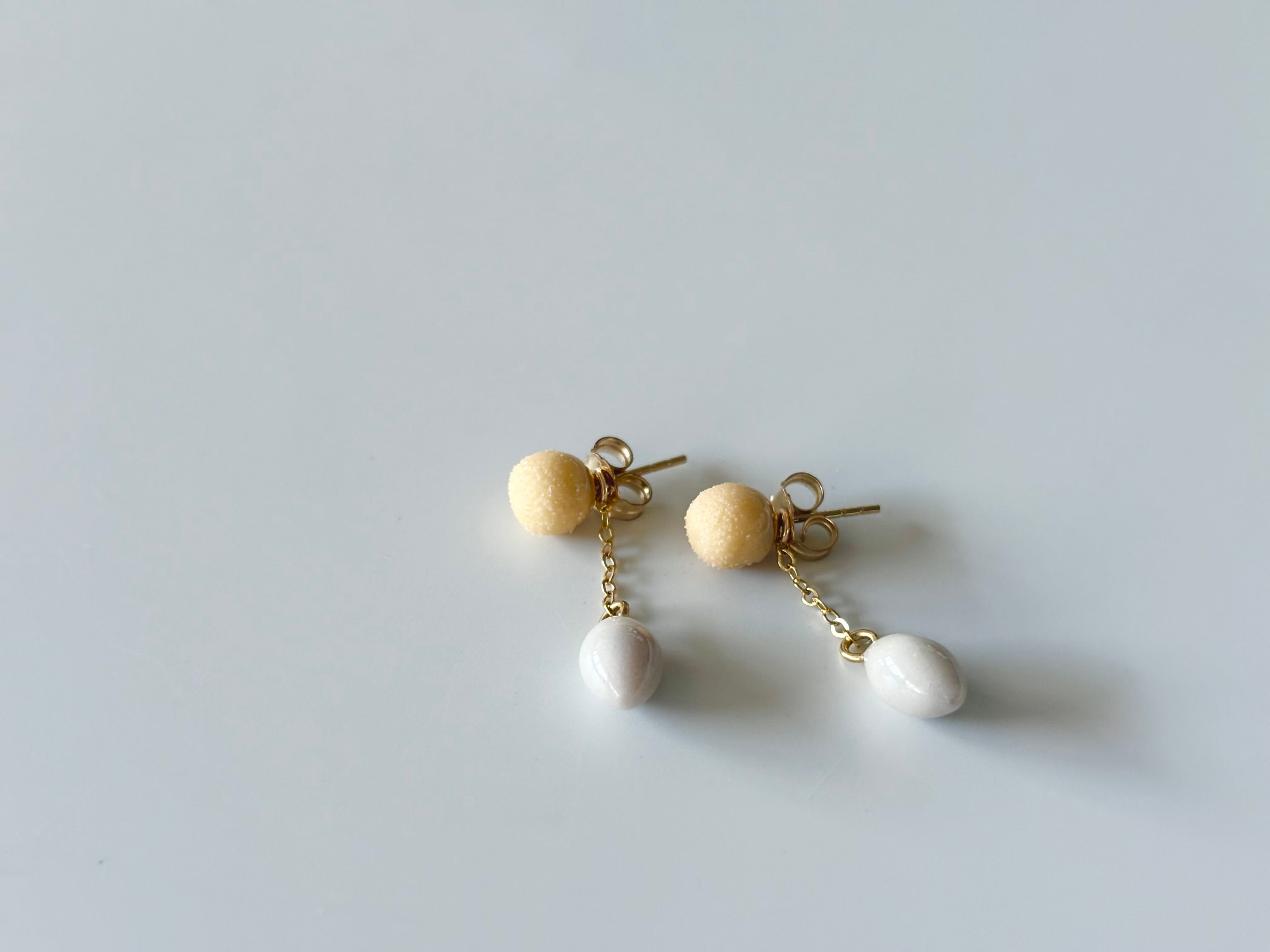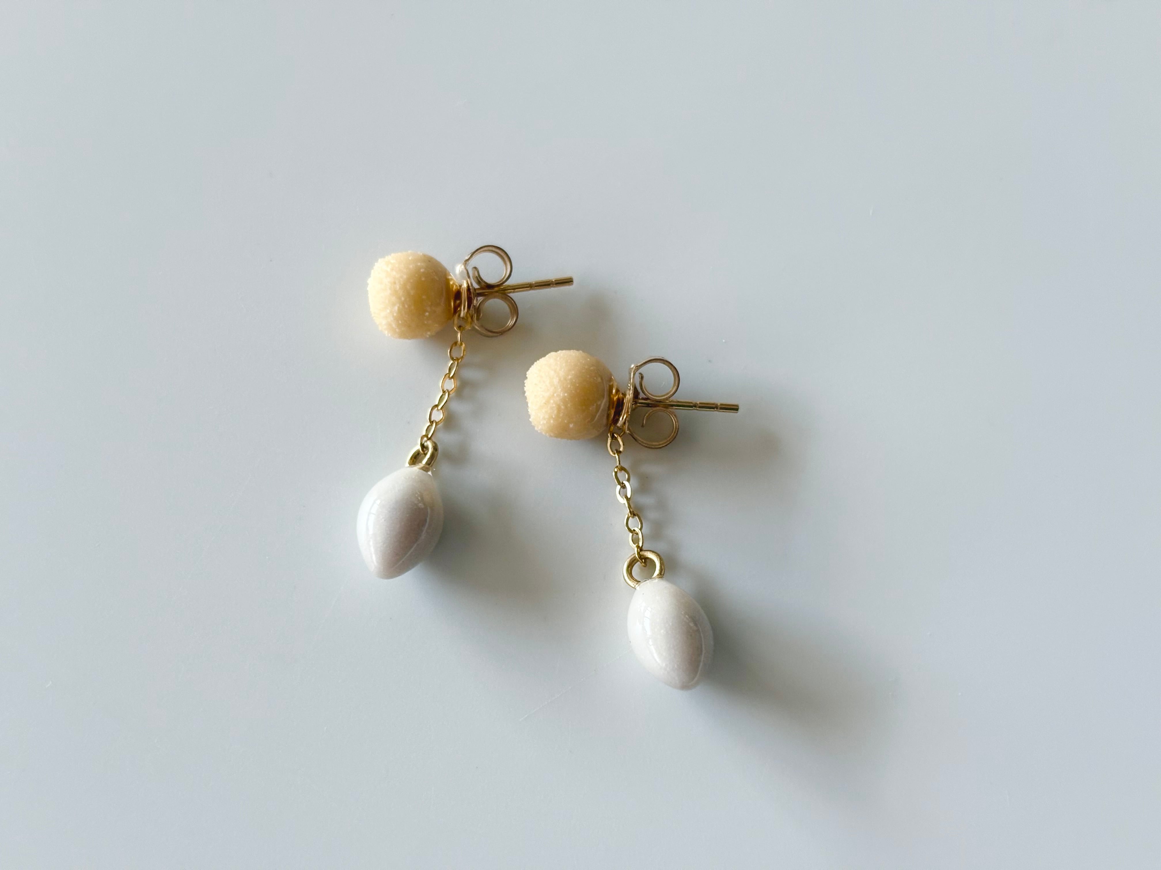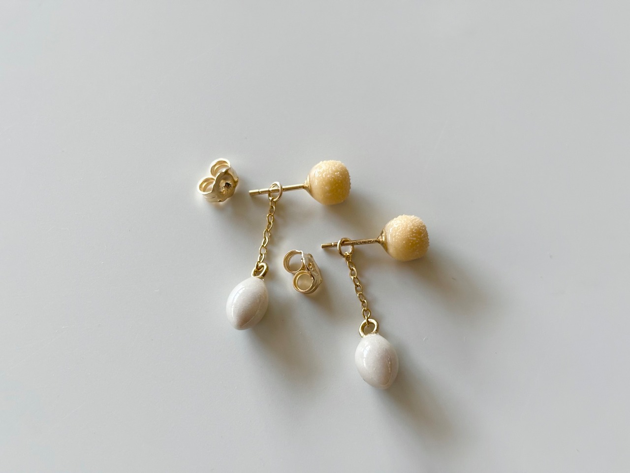 こちらのピアスはチェーン部分が取り外し可能なため、お持ちのピアスとチェーン部分を組み合わせてお使いいただく事や、ピンキーボタン(上の植物)単体でもお使いいただける2wayのピアスとなっております。