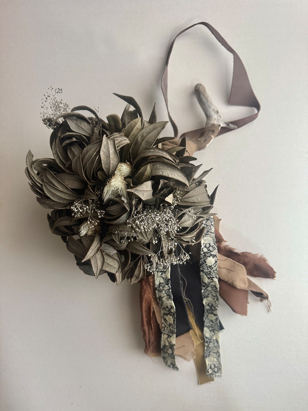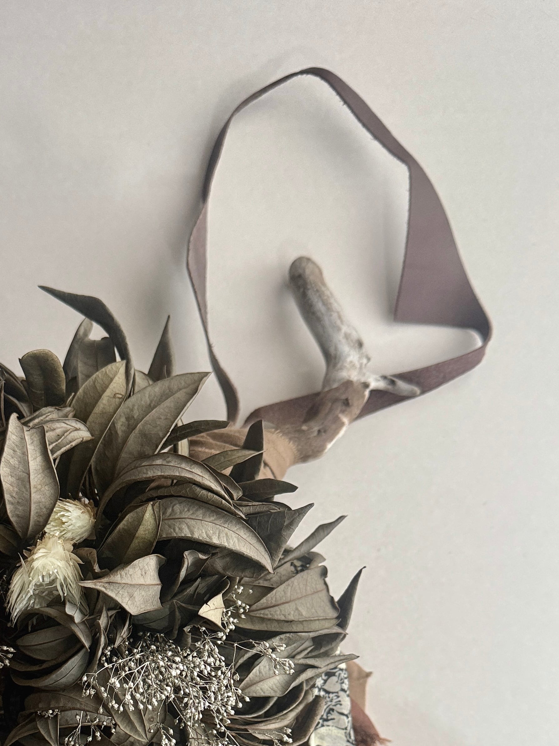 レザーやリネン、流木などを用いて制作した、
